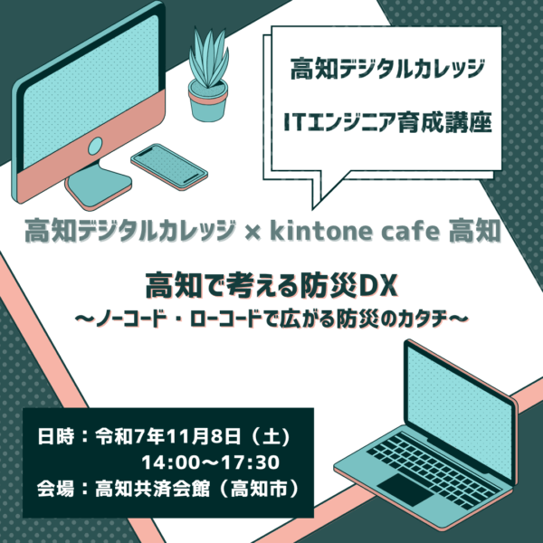 kintone Café 高知と連携し、ノーコード・ローコードツールとして県内でも導入事例が増えているkintoneに関する講座を開催します。 高知の地域課題として「防災」をテーマに、事例紹介や意見交換、ライトニングトークを通じて学び合います。